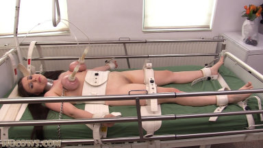 It’s time for Nina Nightbloom’s medical assessment! Don’t forget to do regular checkups on your HuCows! Measuring things like teat stretch and udder expansion capabilities, as well as general health checks, it’s all very important and a big part of keeping HuCattle. Only HuCows in peak condition are beneficial to your farm. Nina Nightbloom is led into the medical room, and the farmer tests her oral skills first. Then she is strapped to the bed to test her teat elasticity with the electronic breast training machine. Nina’s large soft udders are kept in tight steel cuffs. She is still very wide-eyed and scared, but this is her life now. She knows we only want the best for her!