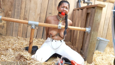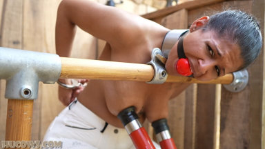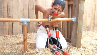 Calisa Bliss found the barn! Even though she was milked hard and long when she was first captured, she was still curious about the rest of the farm. The barn has even weirder machines and frames. Calisa wonders what they are for. Soon, she finds herself topless and locked to the milking frame in a kneeling position. Her protests are silenced with a huge ballgag. Calisa is going to get milked with the most powerful machine: the red cow milker! She struggles and moans, but the farmer does not care. This HuCow will need a lot of sessions before she gets more docile, but Calisa will eventually be a part of the herd. It’s a long and painful process, especially with Calisa’s sensitive nipples. We love the challenge of taming feisty HuCows!