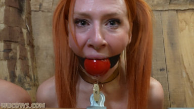 In our effort to make the barn run more efficiently, we need to start combining some milking sessions. Of course, not all of our HuCows have the same training level, but it might be good to milk them together so they can learn from each other. Veteran prized HuCows Denise and Zoey will show newcomer Melodie what the HuCow life is all about. The trio is gagged with huge ballgags as the fearfully watch the farmer prepare the machines. The double goat milker on full power will be hooked up to the udders of Denise and Melodie. Zoey on the left gets the (perhaps even more powerful) compact goat milker. It is very noisy in the barn as these machines all run on their maximum vacuum power. This is an epic sight! Three HuCows get their udders pumped hard, attached by their collars to the milking frame. A little milk starts flowing! Their reward? Painful clover clamps on their sensitive teats. Life in the herd isn’t easy…